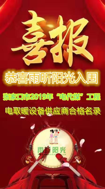 祝賀雨昕陽光入圍2019年“電代煤”工程電取暖設(shè)備供應(yīng)商合格名錄