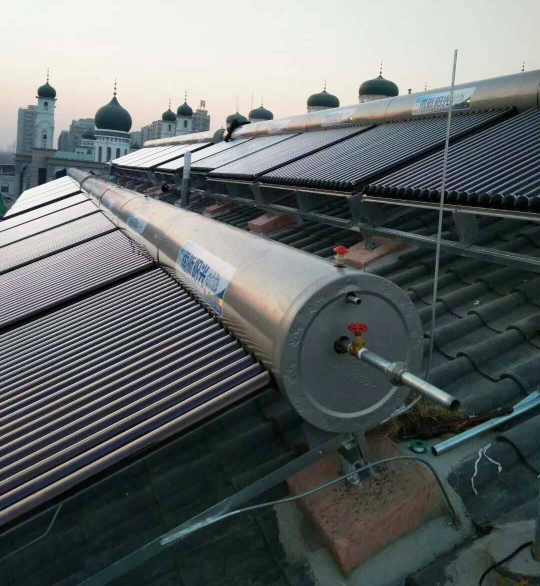 該項目中小學及幼兒園設計采用無菌承壓無動力太陽能熱水器(帶儲水罐),儲水罐內置波接管換熱器,使普通太陽能具有承壓功能,頂水式承壓供水。水箱內膽中的水通過真空管直接加熱,并進行蓄熱,用水時通過波接管換熱器將水箱內的熱量置換出來,承壓供水,水質無污染,操作方便。太陽能熱水器系統(tǒng)同樣作為燃氣熱水器或電熱水器的預熱系統(tǒng),配合恒溫混水閥使用,以防止高溫燙傷。